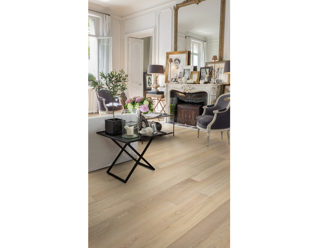 Die hellen Nuancen dieser exklusiven weißen Landhausdiele aus der Capital Collection werden durch eine gleichmäßige Farbvariation zwischen den Dielen ausgeglichen. Nur feinstes Eichenholz wird hier verwendet und jede Diele sorgfältig gebürstet, um den Charakter der Maserung und die natürliche Struktur des Holzes hervorzuheben. Die lichtabsorbierende, ultramatte Lackoberfläche erzeugt den Eindruck von frisch gesägtem Holz und schützt es vor täglichem Verschleiß. Eine vierseitige Fase sorgt für eine klassische Landhausdielenoptik.