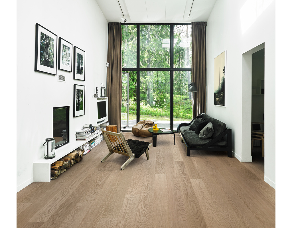 Die grauen Farbnuancen dieser exklusiven Landhausdiele aus der Capital Collection werden durch eine gleichmäßige Farbvariation zwischen den Dielen ausgeglichen. Nur feinstes Eichenholz wird hier verwendet und jede Diele sorgfältig gebürstet, um den Charakter der Maserung und die natürliche Struktur des Holzes hervorzuheben. Die lichtabsorbierende, ultramatte Lackoberfläche erzeugt den Eindruck von frisch gesägtem Holz und schützt das Holz vor täglichem Verschleiß. Eine vierseitige Fase sorgt für eine klassische Landhausdielenoptik.