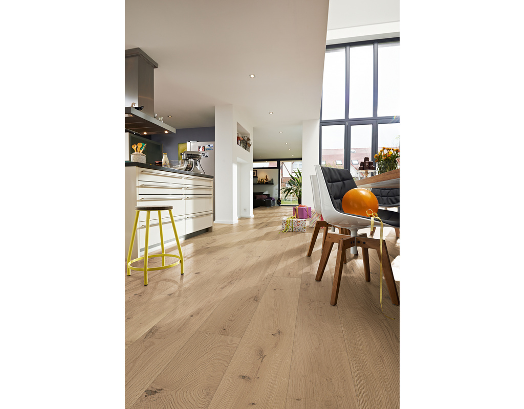Mit seinem Schlossdielenformat kommt der Lindura-Holzboden besonders in großen Räumen perfekt zur Geltung. Der besondere Produktaufbau macht Lindura extrem strapazierfähig und somit auch für viel genutzte Wohnbereiche oder auch Gewerberäume zur gelungenen Bodenlösung. Durch das ultramattlackierte Finish, das jede einzelne Pore benetzt, wirken die Dielen nicht nur extra edel und natürlich, sondern werden auch besonders pflegeleicht, fleckenunempfindlich und resistent gegen Mikrokratzer (kleine Kratzer in der Lackoberfläche, die nicht bis zur Echtholzdeckschicht durchdringen).