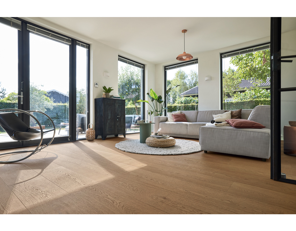 Mit seinem Schlossdielenformat kommt der Lindura-Holzboden besonders in großen Räumen perfekt zur Geltung. Der besondere Produktaufbau macht Lindura extrem strapazierfähig und somit auch für viel genutzte Wohnbereiche oder auch Gewerberäume zur gelungenen Bodenlösung. Durch das ultramattlackierte Finish, das jede einzelne Pore benetzt, wirken die Dielen nicht nur extra edel und natürlich, sondern werden auch besonders pflegeleicht, fleckenunempfindlich und resistent gegen Mikrokratzer (kleine Kratzer in der Lackoberfläche, die nicht bis zur Echtholzdeckschicht durchdringen).