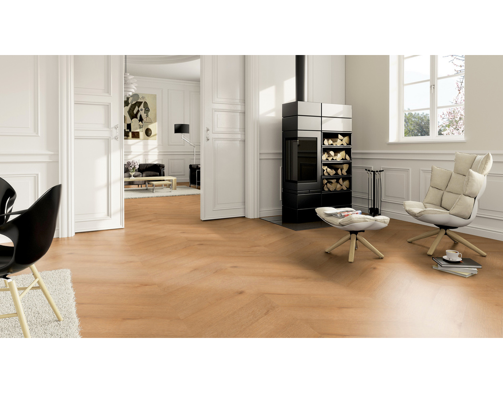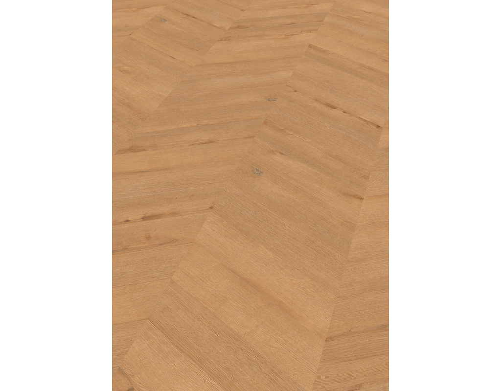Neu bei Soya-Vinyl: Chevron Das Chevron-Verlegemuster, auch als Französisches Fischgrät bekannt, zeichnet sich durch präzise geschnittene Dielen aus, deren Enden im Winkel von 60° abgeschrägt sind und an der Schnittkante aufeinandertreffen. Dadurch entstehen perfekt abgestimmte Spitzen, die eine klare, gleichmäßige V-Form bilden. Im Vergleich zum klassischen Fischgrät-Muster, bei dem die Kopfkante der einen Diele auf das Ende der Längskante der anderen Diele im 45° Winkel trifft, wirkt Chevron ruhiger und strukturierter. Diese unkonventionelle Offenheit kommt besonders in modernen oder repräsentativen Einrichtungen zur Geltung.