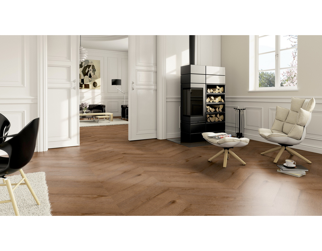 Neu bei Soya-Vinyl: Chevron Das Chevron-Verlegemuster, auch als Französisches Fischgrät bekannt, zeichnet sich durch präzise geschnittene Dielen aus, deren Enden im Winkel von 60° abgeschrägt sind und an der Schnittkante aufeinandertreffen. Dadurch entstehen perfekt abgestimmte Spitzen, die eine klare, gleichmäßige V-Form bilden. Im Vergleich zum klassischen Fischgrät-Muster, bei dem die Kopfkante der einen Diele auf das Ende der Längskante der anderen Diele im 45° Winkel trifft, wirkt Chevron ruhiger und strukturierter. Diese unkonventionelle Offenheit kommt besonders in modernen oder repräsentativen Einrichtungen zur Geltung.