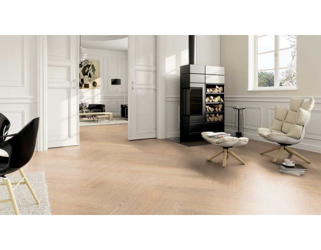 Das klassische, sich kreuzende Verlegemuster im Soya-Sortiment schafft eine feine Balance aus Dynamik und Struktur, ohne dabei aufdringlich zu wirken. Durch die winklige Anordnung entsteht eine spannende Tiefe, die selbst kleinen oder schlicht eingerichteten Räumen eine besondere Raffinesse verleiht.