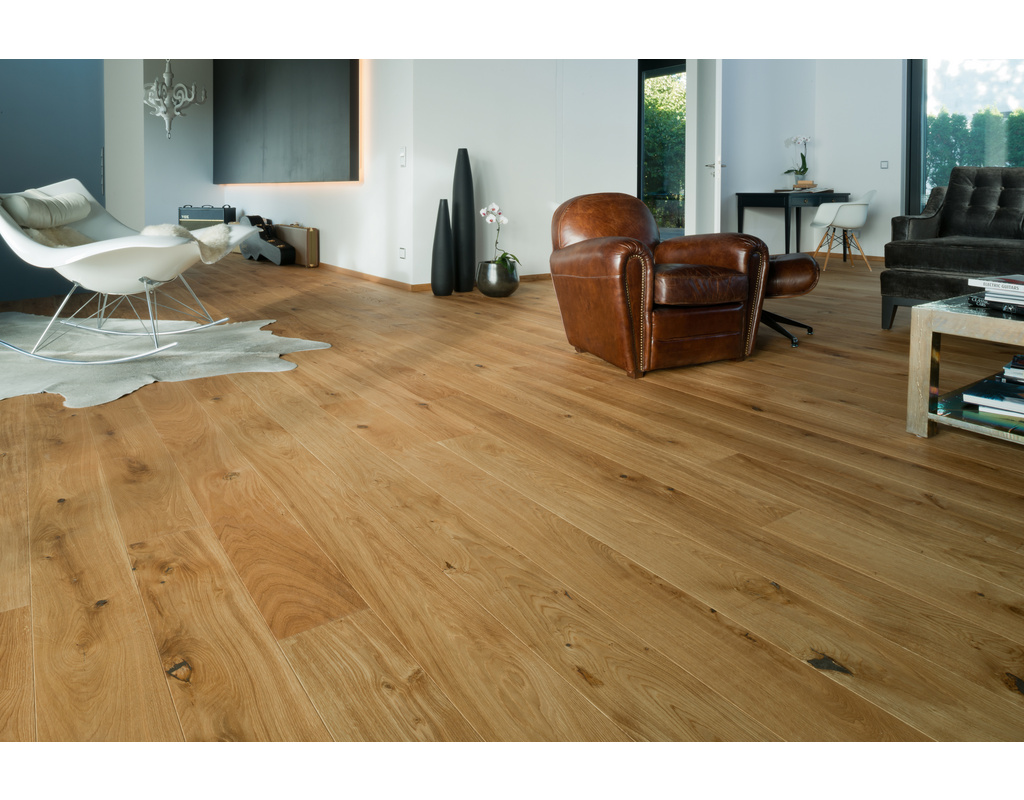 Designstark und geerdet: Sechs CoreColors in lebhaften Holzsortierungen, Innovo NATUR geölt oder Twist PLUS matt lackiert. Für ausdrucksstarke Raumkonzepte und lebhafte Bodenflächen.