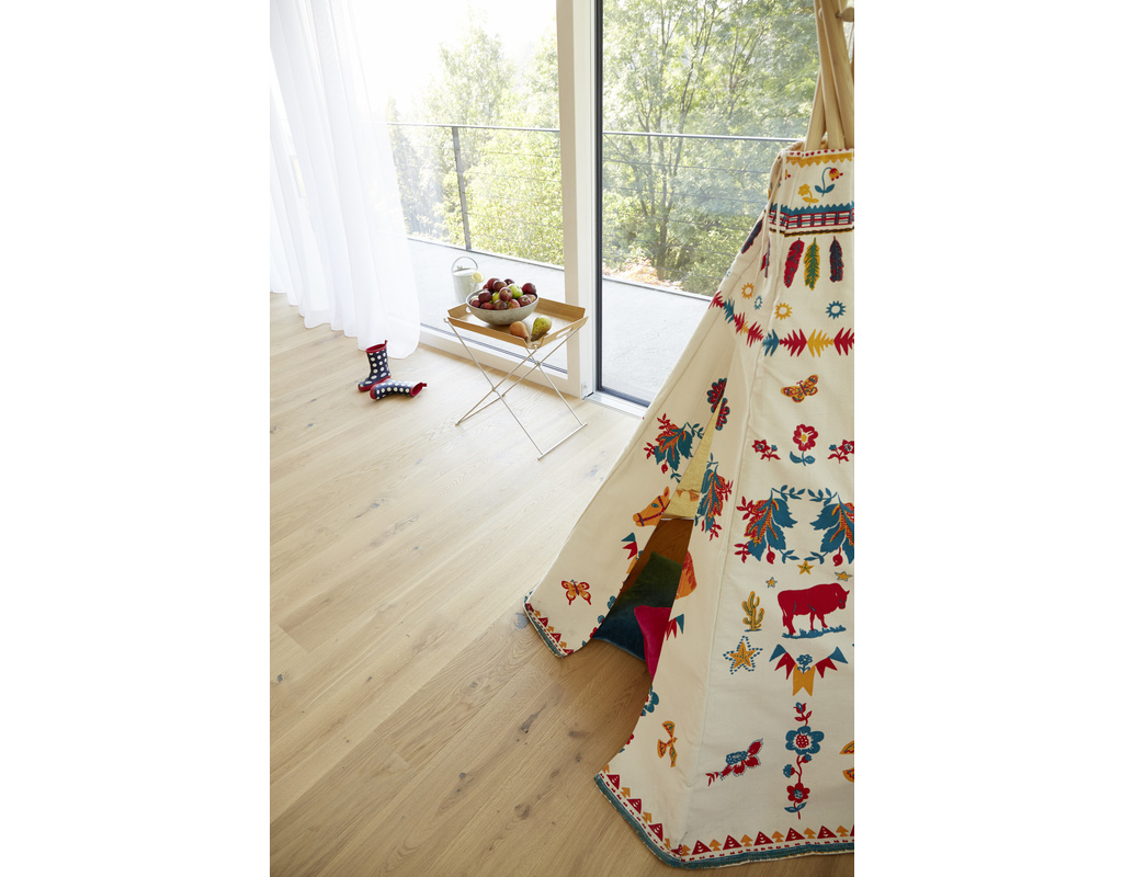Designstark und geerdet: Sechs CoreColors in lebhaften Holzsortierungen, Innovo NATUR geölt oder Twist PLUS matt lackiert. Für ausdrucksstarke Raumkonzepte und lebhafte Bodenflächen.