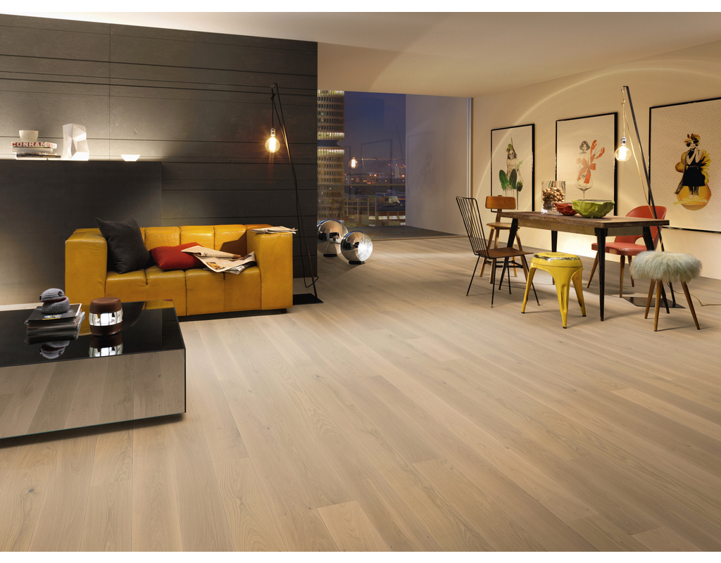Einfache Beratung, da Teil des CoreColor Concepts: ruhige, ausbalancierte Parkettflächen mit 2V-Fuge, Innovo NATUR geölt und Verbindung zu ELITO TREND.
