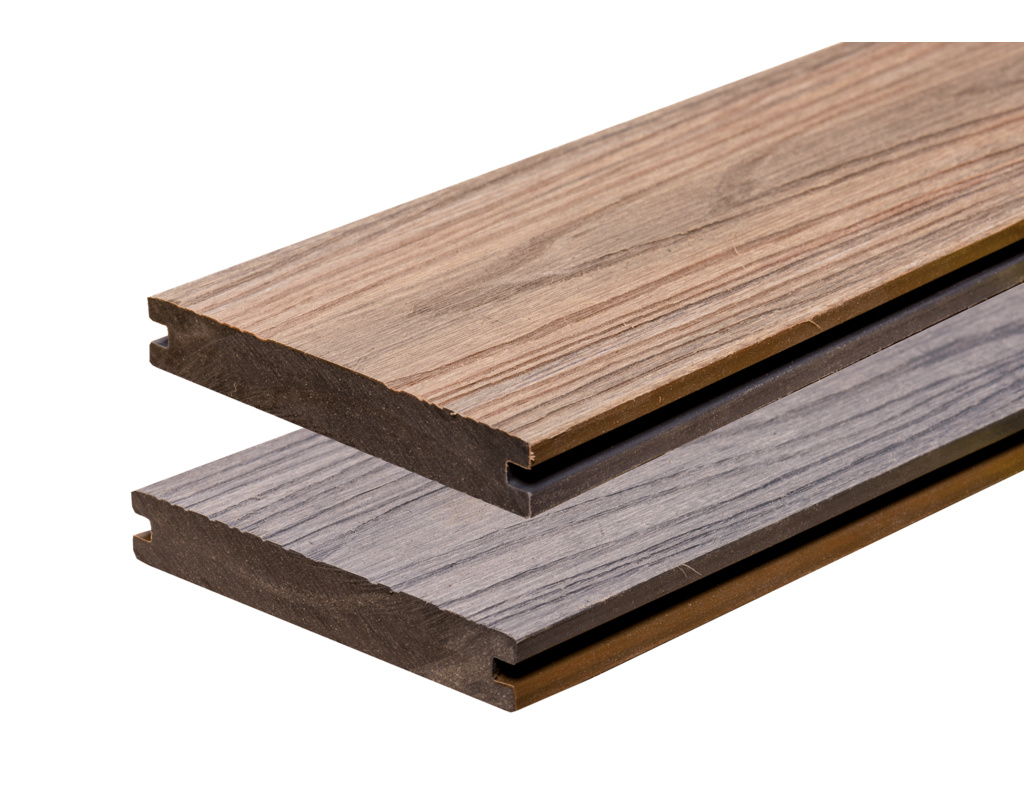 | Produktbildung: | Terrassendiele WPC massiv teak / grau beidseitig Holzstruktur, längsseitige Nut - 20 x 143 mm |