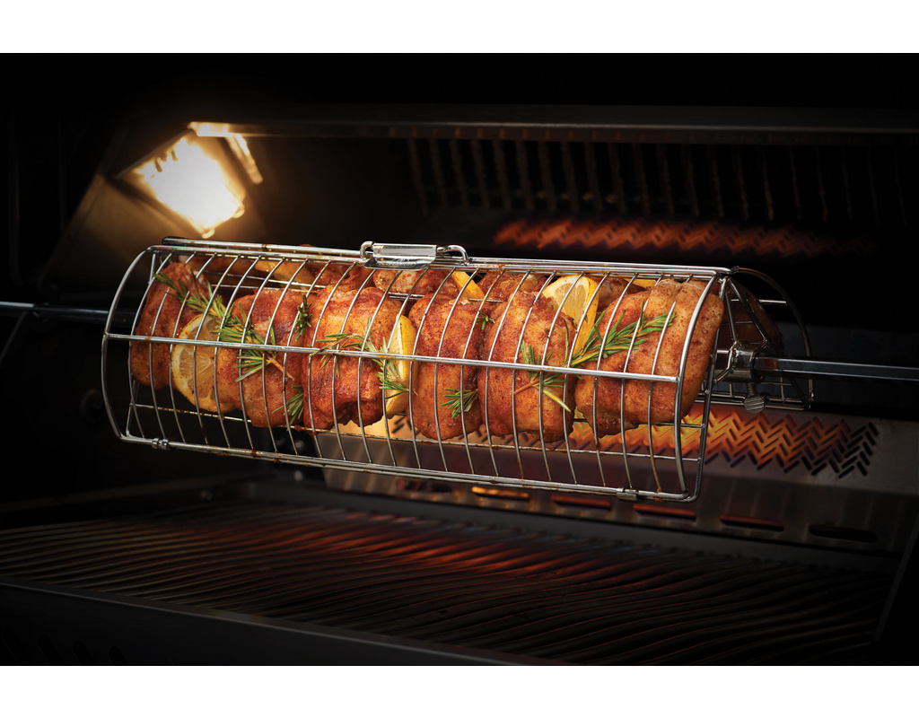 Drehkorb mit zwei Kammern für alle Napoleon®-Rotisserie-Systeme. Durch die Anordnung der zwei Grillkammern wird eine beidseitige Röstung des Grillguts gefördert.