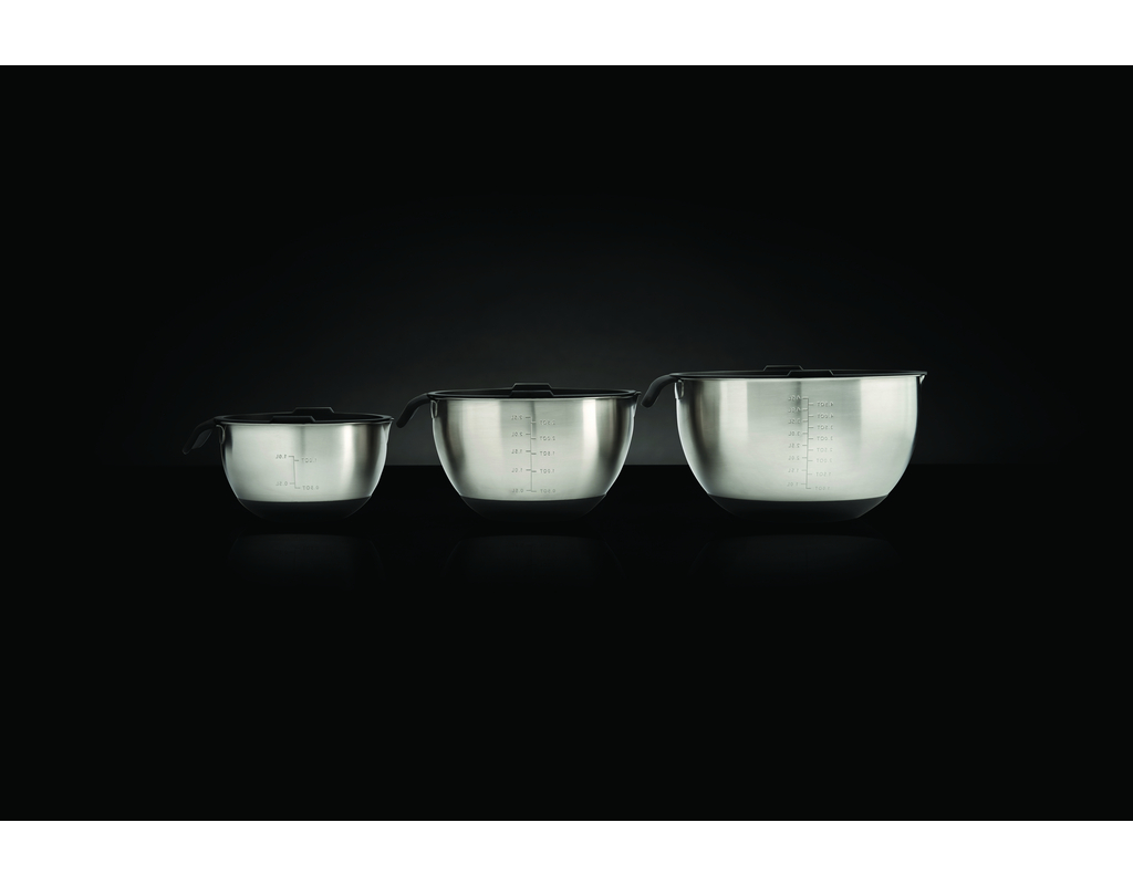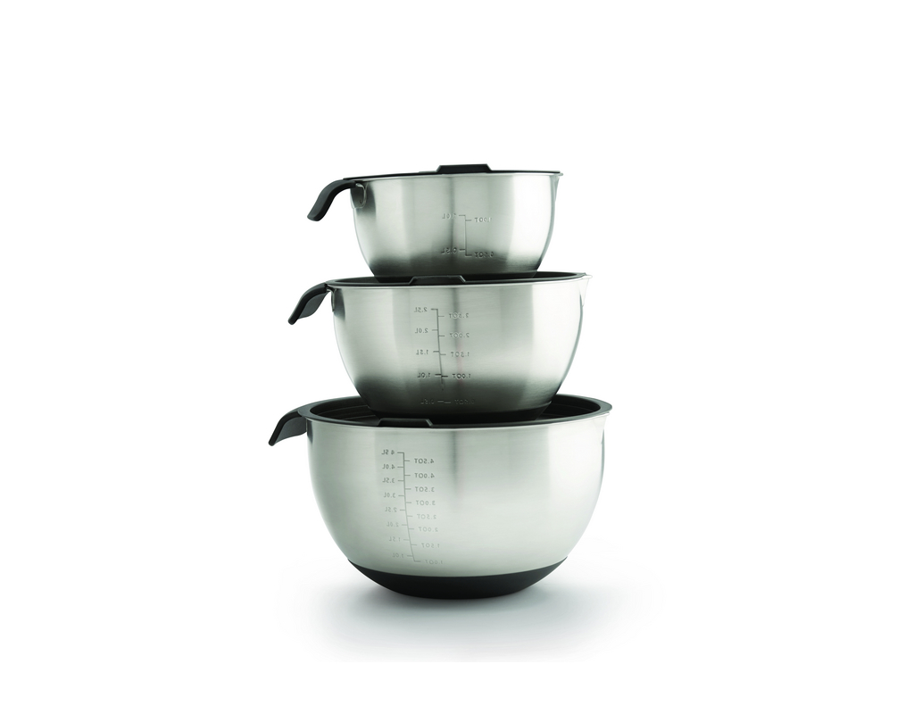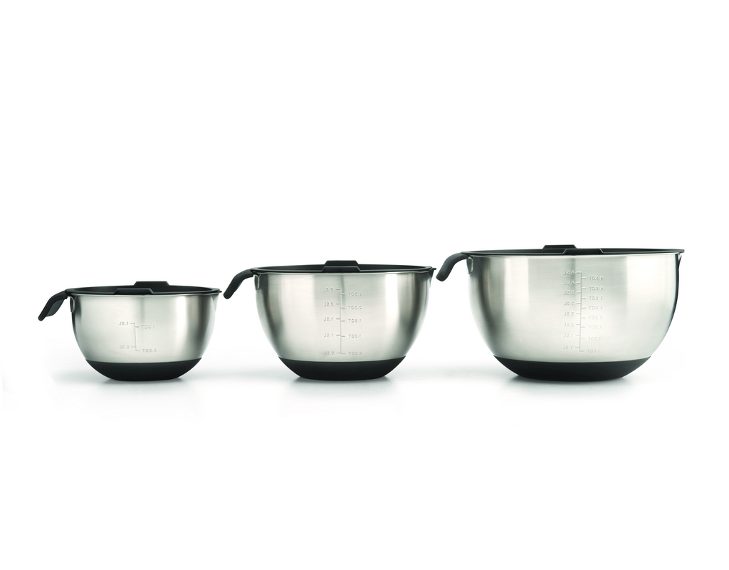 Napoleon® Edelstahlschalen in drei Größen. Metrische und imperiale Maßeinheiten innen. Luftdichte Deckel halten Lebensmittel länger frisch (im Kühlschrank oder in der Speisekammer). Unterteil aus Silikon verhindert Verrutschen.